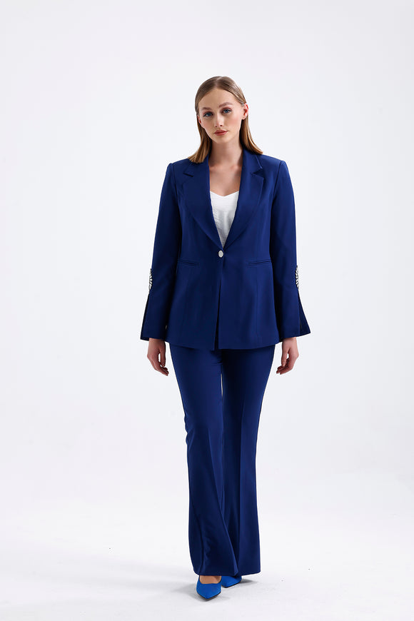Semperiba Kol Detaylı Kadın Blazer Ceket Pantolon Takım Lacivert